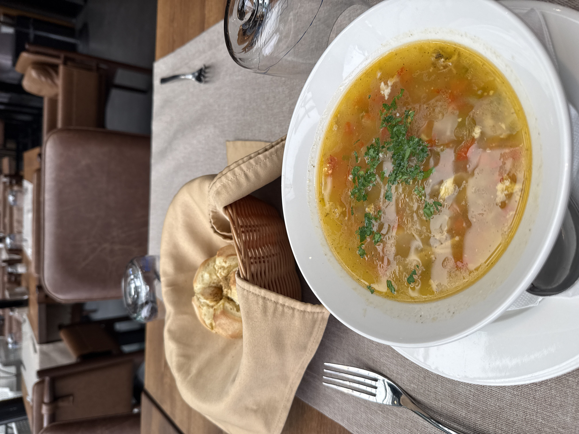 The image displays a dining table setting within an indoor restaurant in Sofia, Bulgaria. In the foreground, a white ceramic bowl holds a yellow-broth soup containing diced red and orange vegetables, white components, and green herb garnish. The bowl rests on a white saucer, beneath which a white napkin and a portion of a spoon are visible. To the left of the bowl, a silver-colored four-tined fork lies on a light taupe fabric placemat. To the right, an inverted, empty clear glass tumbler is present. A second inverted clear glass is positioned further back on the table. Adjacent to the soup, a woven wicker basket, lined with a light tan cloth, contains a single golden-brown bread roll. The table surface is wood. The background shows blurred details of a restaurant interior, including multiple brown leather-upholstered chairs and additional wooden tables set with similar placemats. No individuals are visible in the frame.