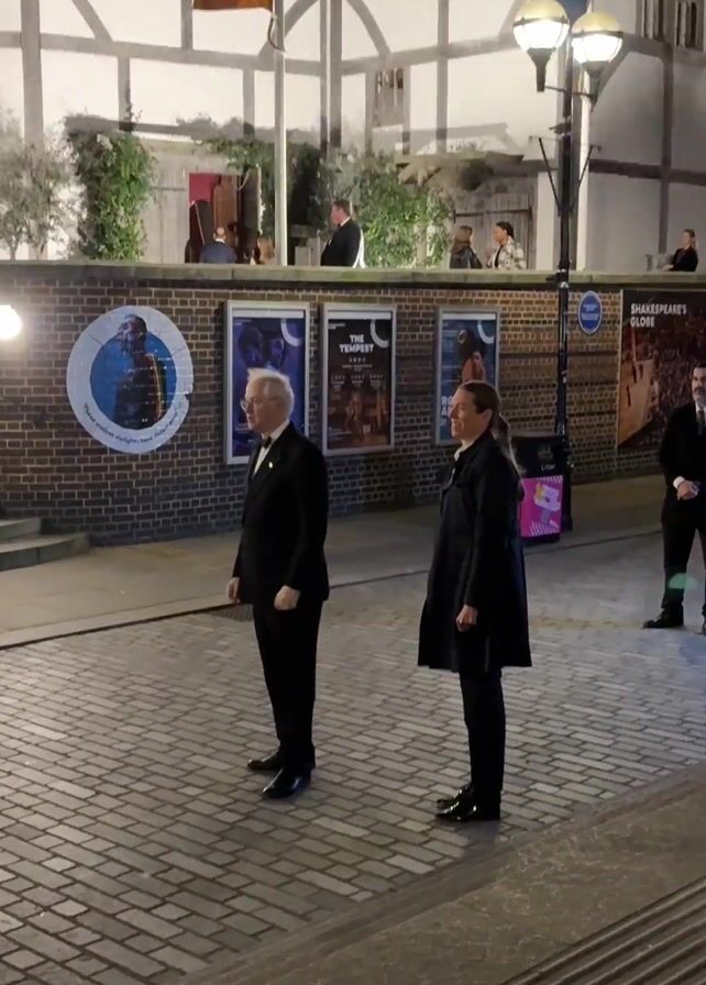 two people standing in front of the Shakespeare's Globe theatre in London at night. The man on the left is wearing a black suit and bow tie, while the person on the right is wearing a black coat and pants. There is a security guard to the right of them. Behind them is the brick wall with theatre posters including "The Tempest", and people dining on the balcony above.