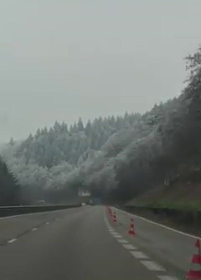 The video depicts a drive on a highway bordered by a snow-covered forest. The day is overcast and visibility is slightly reduced due to the weather. The road is marked with white dashed lines, and a series of orange traffic cones line the shoulder. A few vehicles can be seen distantly ahead on the road. The trees on the adjacent hillside are visibly coated with frost or snow, creating a wintry scene.