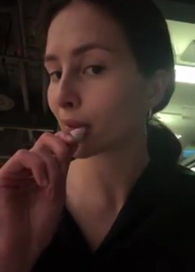 A woman is holding a small white tube to her lips, potentially applying lip balm or lipstick. She is indoors, seated in a gray chair, wearing a black top. The background reveals part of what appears to be a cafe or restaurant with lighting fixtures, glass panes, and a glimpse of decor. The lighting is subdued, and the camera angle is slightly high, suggesting she is recording a selfie video.