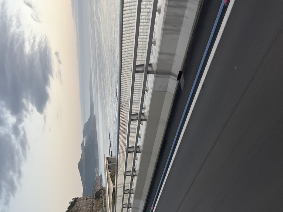 A view from a bridge overlooking a coastline. The bridge railing is visible on the right side of the image. In the background, there is a body of water with mountains or cliffs along the coast. The sky is cloudy and overcast. The overall scene conveys a sense of height and distance.