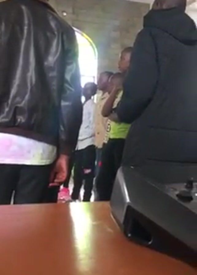 group of young boys standing in a line in a church. Two adults stand in front of them, facing the boys. The adults are both wearing jackets, and their backs are to the camera. The boys are wearing a variety of clothing, including striped shirts, t-shirts, and pants. A church window is visible in the background. A speaker sits on a wooden table in the foreground. The environment appears to be well-lit.