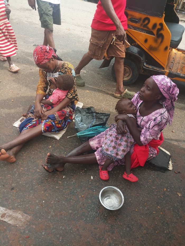 Two women are seated on an asphalt road in Onitsha, Nigeria, each holding an infant