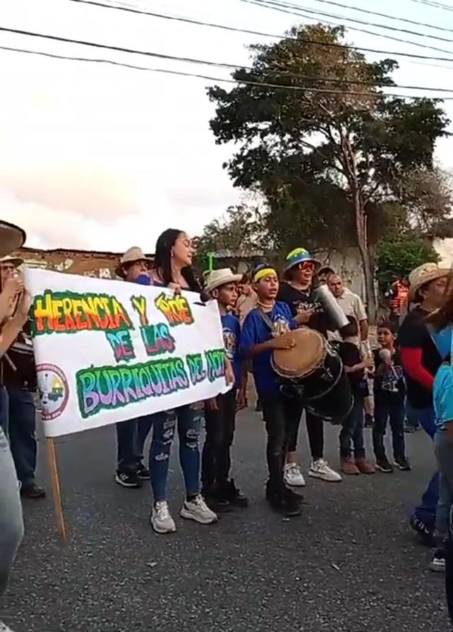 A group of people are walking down a street in a parade. They are carrying a banner that says "Herencia Y ROE DE LAS Burriquitas DEL NORTE." Some are wearing straw hats and playing musical instruments, including a drum. The street is asphalt and the sky is overcast. There are buildings and trees in the background. The group is walking toward the camera.