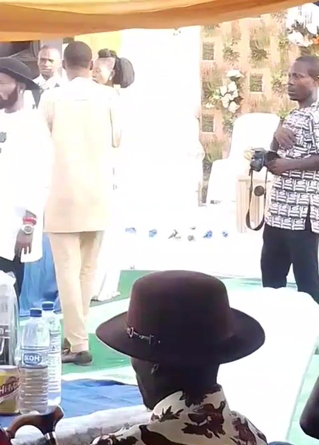The video depicts an outdoor event, possibly a wedding reception. Under a canopy tent with orange and blue draping, people are gathered. A man in a white shirt and black pants stands in the center speaking into a microphone, gesturing with his left hand. He is wearing a black hat and sunglasses rest on his shirt. To his right, a man in a tan suit stands with a woman in a white dress. To his left, a man in a patterned shirt holds a camera. Other guests are seated in chairs in the background, some wearing traditional African clothing. In the foreground, a table is visible with water bottles, drinks, and a red flower. The overall lighting is bright and sunny. The setting suggests a celebratory occasion.