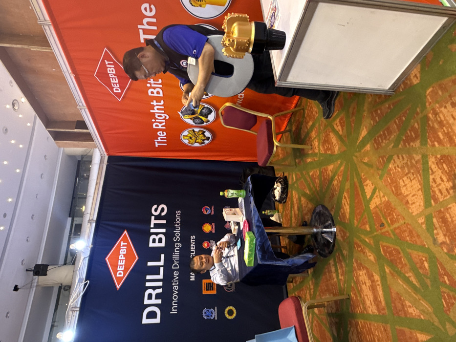 The scene depicts an indoor trade show booth for "DEEPBIT DRILL BITS" in Itirin, Nigeria