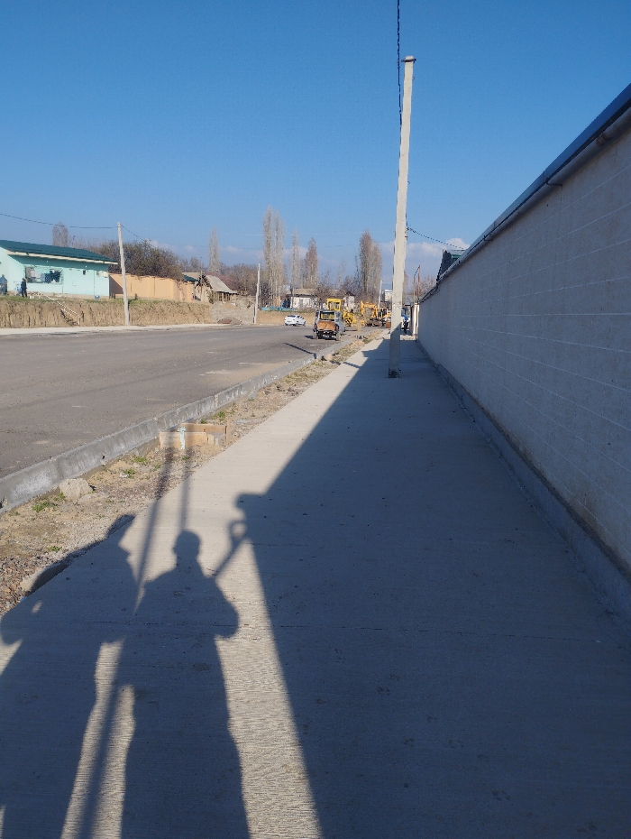 The image depicts a brightly lit street scene in Chirchik, Uzbekistan, under a clear blue sky. In the immediate foreground on the right, a concrete sidewalk runs parallel to a light-colored, horizontally block-patterned wall. Two distinct human shadows, cast from a low sun angle, are visible on the sidewalk, with one shadow appearing to hold an object. A tall, gray utility pole stands upright on the sidewalk near the wall, casting a long shadow across the pavement. To the left of the sidewalk, an asphalt road runs through the frame, separated by a concrete curb and a narrow strip of dirt. Two vehicles, a light-colored sedan and a light-colored pickup truck, are observed on the road, traveling away from the viewer. Further down the road, several yellow construction vehicles, identified as excavators or similar heavy machinery, are parked on the right side of the roadway. Across the street, an elevated light-blue building with a green roof is visible, with a faint human figure near its base. The background features numerous bare deciduous trees interspersed with various residential structures, indicating a semi-urban or suburban environment.