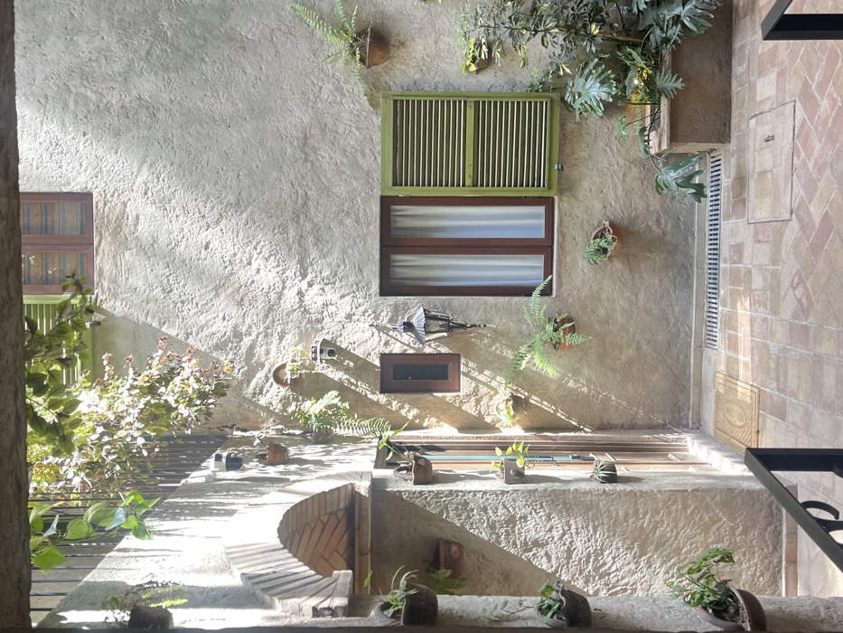 The image captures an enclosed outdoor courtyard or patio within a building complex in Santa Ana Portales, Mexico