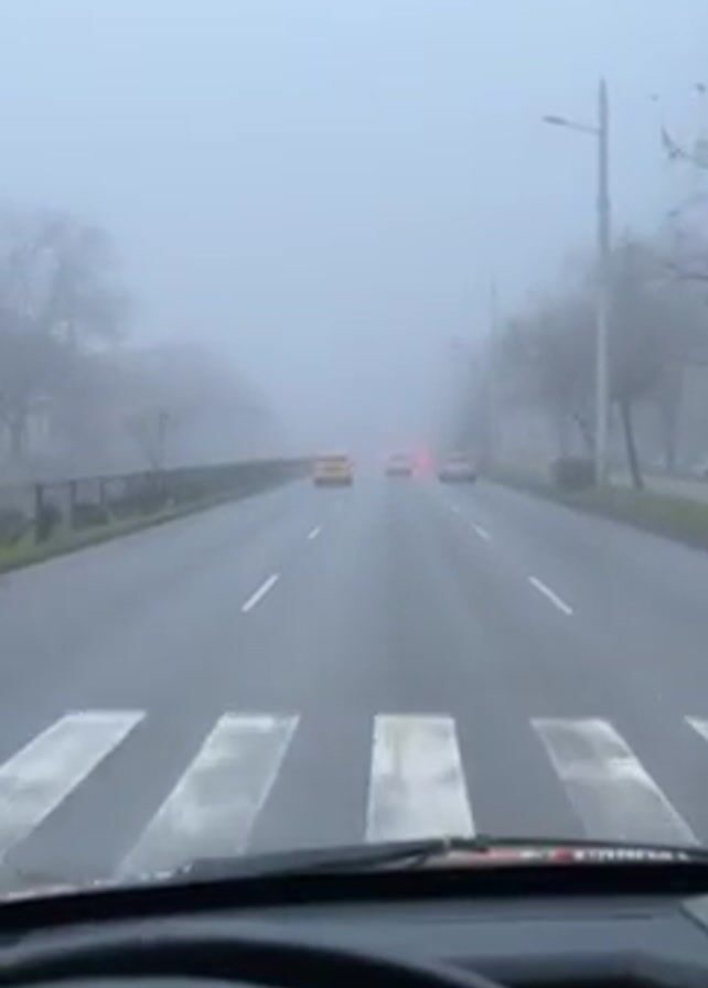 The video, shot from the inside of a car, shows a view of a foggy road. There is a crosswalk in the foreground, and a couple of cars are visible in the distance. The fog is so thick that visibility is limited. There are streetlights and trees lining the road, but they are obscured by the fog. A car passes on the right.