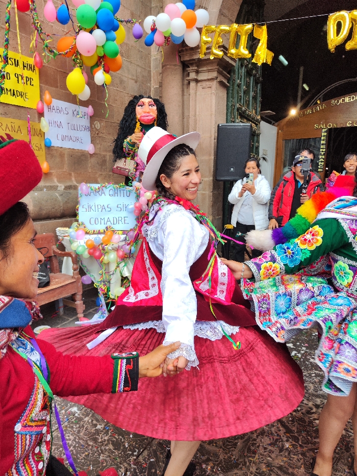 - "People dressed in traditional Peruvian attire are dancing outside a building adorned with balloons and decorations" by FM-20kwN2, licensed under CC BY 4.0