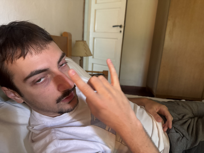 A man lies on his back in bed, giving a "rock on" hand gesture towards the camera. He has dark hair, a mustache, and is wearing a white t-shirt and gray pants. Behind him, a lamp sits on a nightstand next to the bed. In the background are a closed, white door and a wooden wardrobe. The room is bathed in natural light. The man appears relaxed or tired.