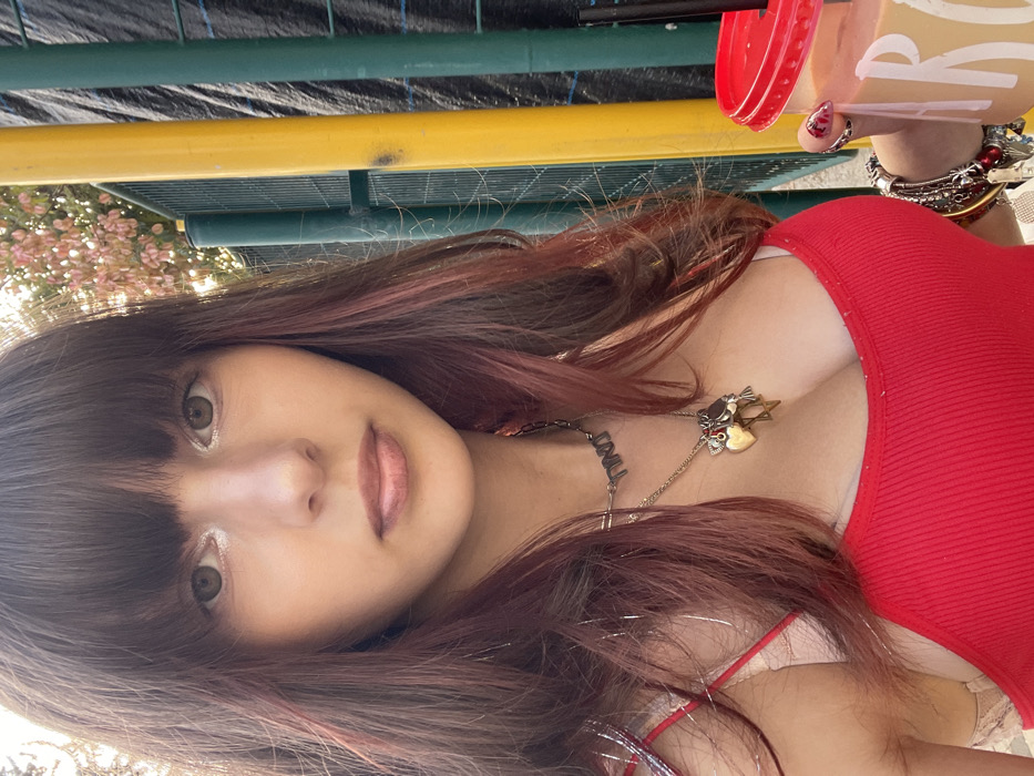 A female subject is depicted in a close-up, waist-up portrait, taken outdoors under natural light. She has long, dark brown hair with reddish undertones and bangs across her forehead, and light-colored eyes with shimmer eyeshadow. Her attire consists of a red ribbed tank top, with a light-colored bra strap visible on her left shoulder. She wears two necklaces: a silver-toned chain with a pendant reading "TINO" or "NINO," and a longer, darker chain adorned with multiple charms, including a gold-colored heart and a Star of David. Her right hand, displaying several bracelets and red-patterned fingernails, holds a transparent plastic cup with a red lid and a black straw, containing a light brown beverage. The background features a green metal fence with a prominent yellow vertical pole on the right side. Behind the fence, a dark tarp or fabric is visible. Foliage with pinkish or reddish leaves is present on the left side of the background. A specific location within the city of Raanana, Israel, cannot be ascertained from the visual evidence.