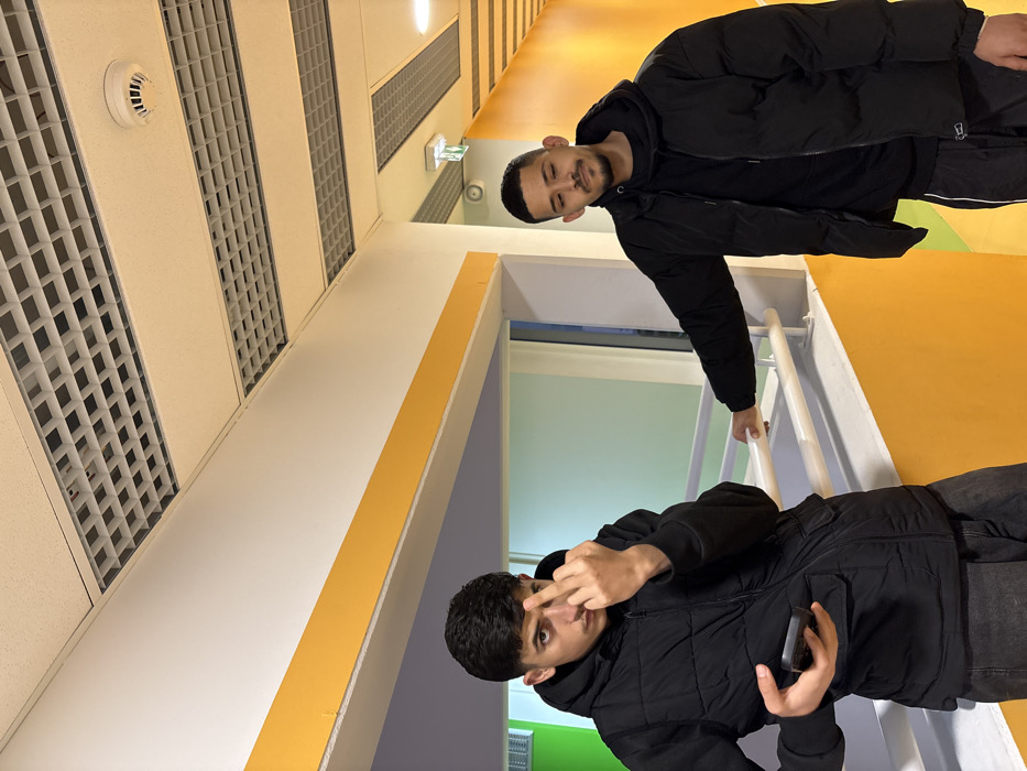 Two young men in black jackets stand in what appears to be a school hallway