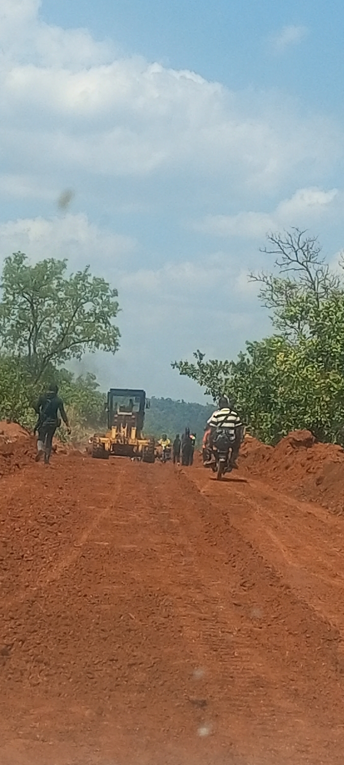 This image depicts a dirt road, assumed to be in Ayale, Nigeria, under a partly cloudy blue sky. The reddish-brown road surface shows tire tracks and loose earth, with significant piles of the same material forming embankments on both sides. Green foliage, comprising trees and bushes, lines the road and extends into the background, where distant hills are visible. From foreground to background, the scene includes: On the left side of the road, a person in dark clothing, possibly black, walks away from the camera. This individual appears to carry an item or backpack on their back. Further down the road, centrally positioned, a yellow road grader faces away from the camera. A plume of dust or exhaust is visible behind the machinery. To the right of the grader, a small group of approximately three to five individuals are gathered or walking on the road. On the right side of the road, a person rides a dark-colored motorcycle, also heading away from the camera. The rider wears a horizontally striped shirt, possibly black and white, and the motorcycle carries items on its rear rack. The overall scene suggests active road construction, maintenance, or recent grading, with people and vehicles utilizing the unpaved thoroughfare.