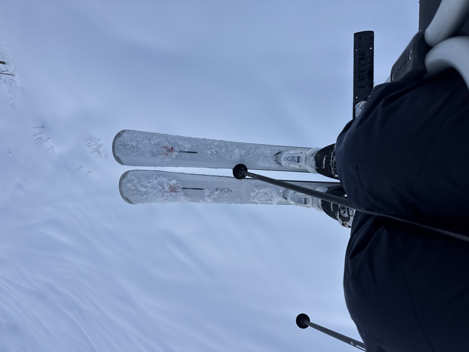 A first-person perspective image from a ski lift in Limone Piemonte, Italy, looks downward at a skier's equipment and the snowy environment