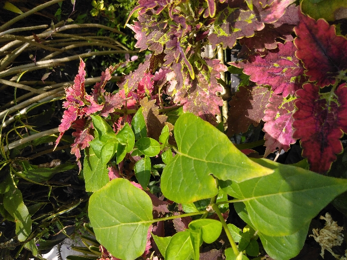 This image depicts a vibrant botanical scene in Oslo, Norway, featuring a dense arrangement of foliage plants under direct natural light. In the foreground, several large, bright green, cordate or ovate leaves are prominent, exhibiting slight yellowish discoloration along some veins and margins. Dominating the midground and extending to the right are multiple Coleus plants (*Plectranthus scutellarioides*), characterized by deeply serrated, variegated leaves. These leaves display a rich reddish-purple base color, intricately patterned with patches of vibrant green, particularly along the veins and edges. The background shows blurred, slender, upright stems or bare branches of other plants, along with darker green foliage. The scene is illuminated by strong sunlight from the upper left, creating distinct highlights and shadows across the varied leaf textures. No human subjects, animals, or specific man-made objects other than the implied planting environment are visible.