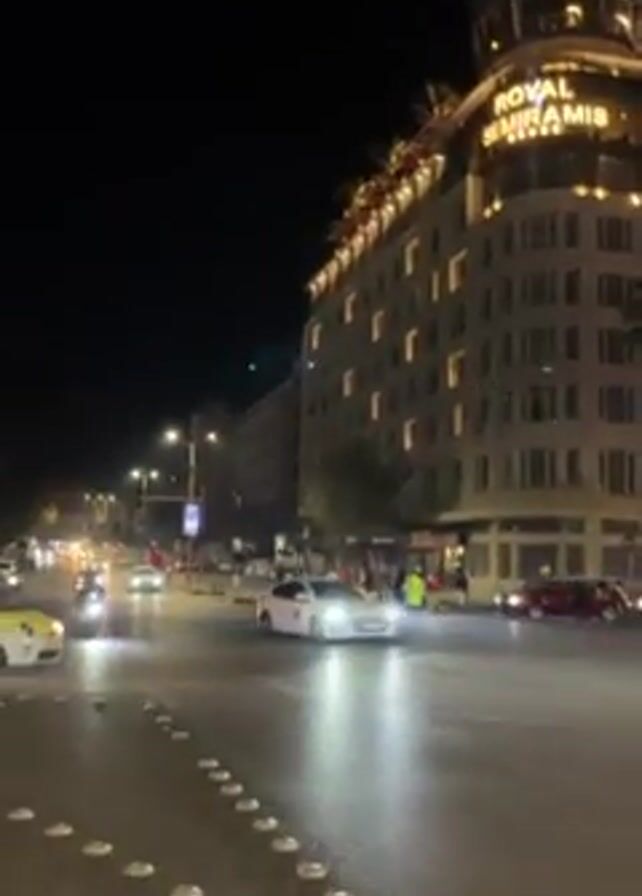 night view of a city street. A tall building with the illuminated sign "ROYAL SEMIRAMIS HOTEL" is on the right side of the frame. Several cars, including yellow taxis and white sedans, are driving on the street. A person on a bicycle is visible crossing the street. The road is wet, reflecting the lights. Street lights illuminate the scene. The sky is dark.