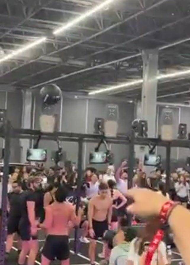large group of people exercising in a spacious, indoor facility. Most of the participants are lifting black medicine balls above their heads. Many are shirtless. The floor is marked with grid lines. Spectators are watching and filming the exercise session. The building has a high ceiling with exposed metal beams and fluorescent lighting. Speakers are mounted to the ceiling, and monitors are affixed to the exercise equipment. A large yellow warning sign with an electrical symbol is visible on a structural element in the foreground.
