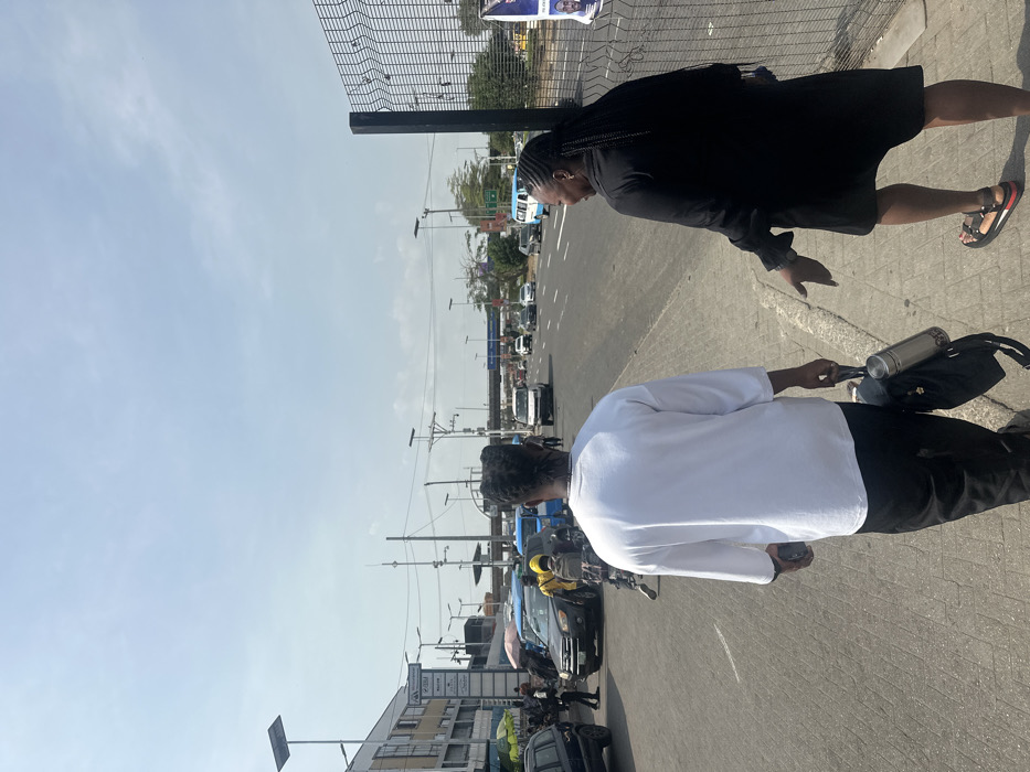 The image depicts an urban street scene in Lagos, Nigeria, specifically on Ozumba Mbadiwe Avenue, Victoria Island. In the foreground, two individuals walk away from the camera on a paved surface alongside a multi-lane asphalt road. The person on the left is a male, wearing a white oversized long-sleeved shirt and dark trousers, with dark braided hair. He carries a dark backpack with a silver cylindrical object (possibly a thermos or water bottle) protruding, and holds a dark mobile phone in his right hand. The person on the right is a female, wearing a black long-sleeved top/dress and black sandals with red and white accents, with long dark braided hair. She is looking towards the male and has her right hand extended in a gestural posture, suggesting an ongoing conversation. The road features moderate vehicle traffic, including white vans, sedans, and blue commercial buses/minivans, moving in both directions. On the left side of the road, several vehicles are parked near a commercial building, and pedestrians are visible. The commercial building on the left is multi-storied with a light-colored facade and features multiple commercial signs, including "Grand Square," "Jumia," "MTN," and "Chicken Republic." Solar panels are mounted on its roof. Tall streetlights with solar panels line the road and median. A tall, dark metal mesh fence runs along the right side of the road, with a partially visible poster affixed to it. In the background, an overhead concrete bridge/flyover spans the road. The sky is clear and light blue, indicating daytime conditions.