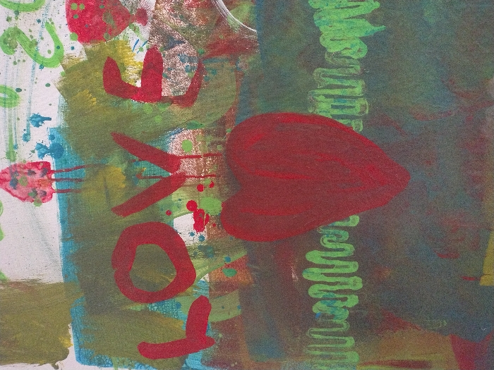 A colorful mixed-media piece features the word "LOVE" vertically in bold red, juxtaposed against a red heart shape on the right. The background incorporates various artistic elements, including green brushstrokes, scribbled lines, and areas of blended green and blue tones. Random splashes of blue, red, and green paint add a playful touch. The overall composition evokes a sense of abstract expressionism.