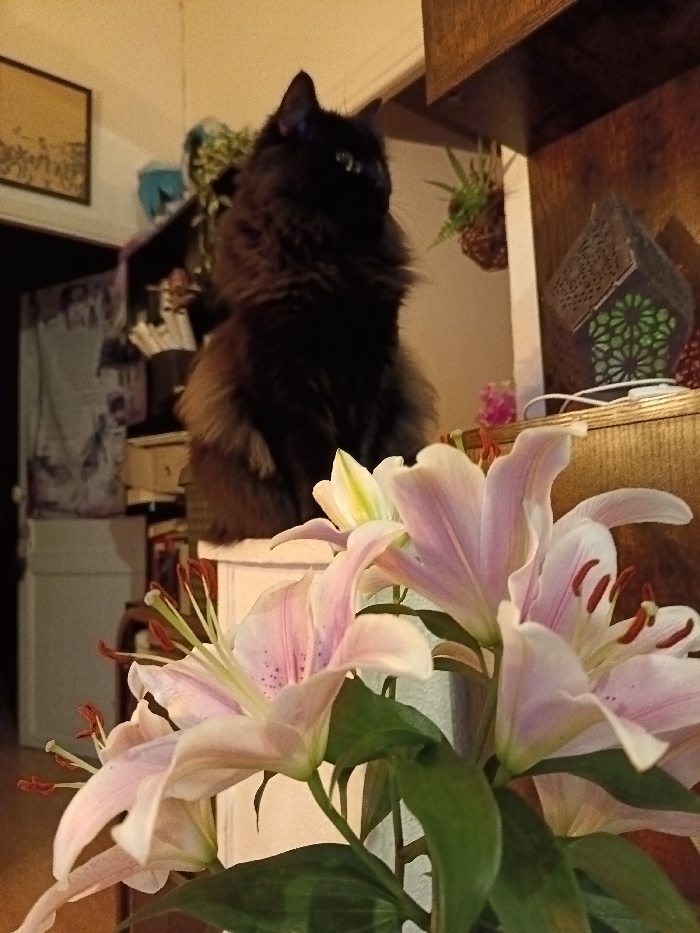 This image captures an indoor scene within a residence in Toulouse, France. In the immediate foreground, a bouquet of several light pink and white lilies with visible green stems and leaves is positioned, with some petals displaying faint reddish-brown speckles and prominent yellow-orange anthers. Behind and to the left of the lilies, a fluffy, long-haired black cat is seated upright on a white surface, its head turned towards the right side of the frame, with visible reflective eyes. The background consists of a domestic interior: to the far left, a framed artwork hangs on a light-colored wall above a partial view into another room featuring patterned fabric. To the right, a wooden shelf unit is visible, with a decorative lantern-like object emitting a green light from its patterned interior, and a small plant hanging from above. The scene is illuminated by warm, soft ambient lighting.