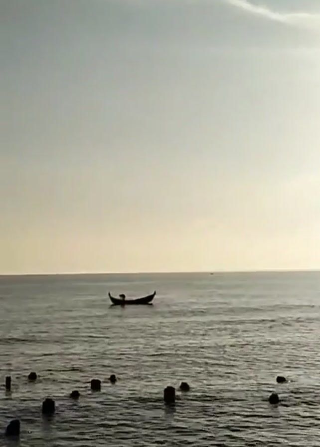 view of the ocean under a bright, slightly hazy sun. A small boat with a person inside is seen in the distance. In the foreground, there are several dark objects, possibly posts or pilings, sticking out of the water. As the camera pans slightly, the sun's reflection on the water becomes more prominent, creating a shimmering effect. A person stands at the edge of the water to the lower right of the frame. The overall tone is serene.