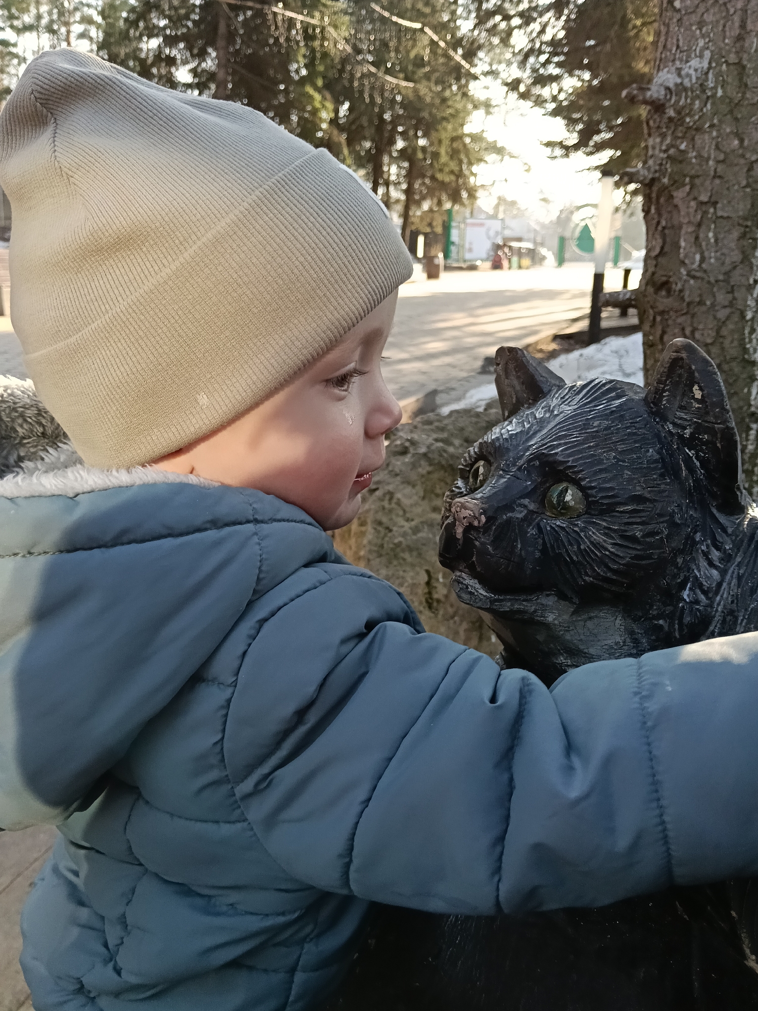 A young child, viewed in profile from the left, directly faces a dark-colored cat statue in a park setting within Domodedovo, Russia