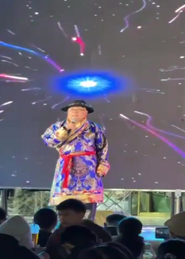 A man stands on a stage performing in front of a crowd. He wears a patterned robe, black hat, and black boots. Behind him, a large screen displays an animated light show. The man is holding a microphone in his right hand and occasionally touches his face with his left. The stage is elevated, and the crowd in front of the stage appears to be seated at tables. Someone in the crowd uses their phone to record the performance. The lighting effects on the screen behind the performer include bursts of green, pink, and white light, creating a cosmic effect.