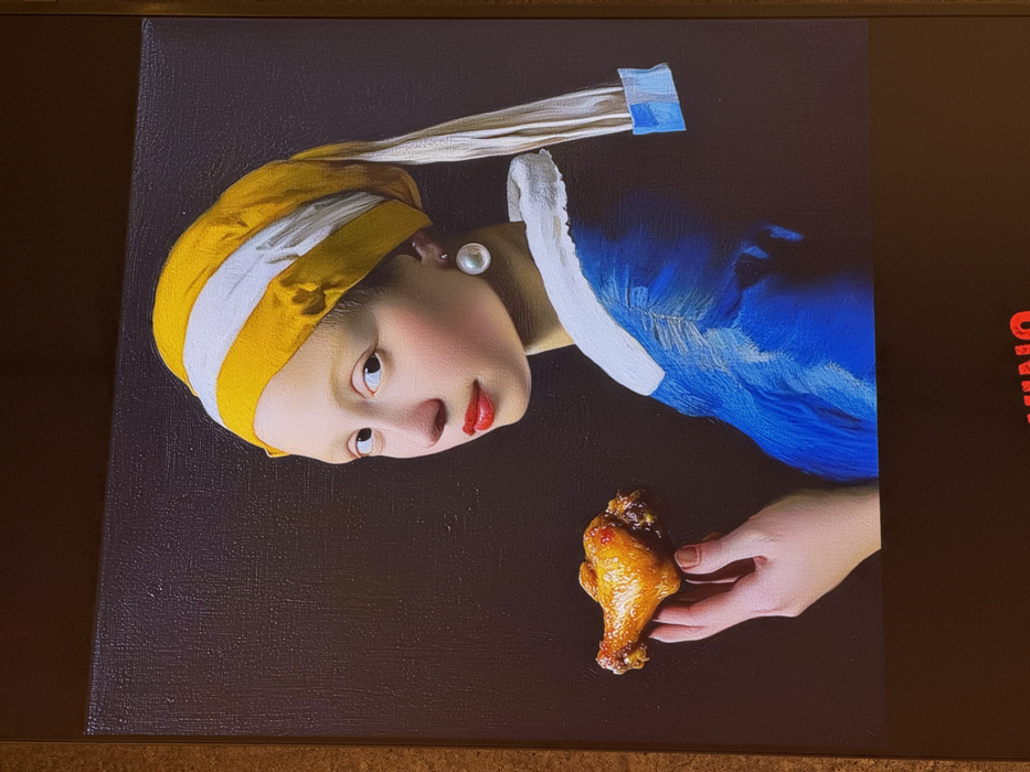 A framed artwork is displayed indoors in Madrid, Spain. The artwork is a contemporary reimagining of Johannes Vermeer's "Girl with a Pearl Earring," featuring a young woman with a fair complexion, light eyes, and red lips, looking towards the viewer. She wears a yellow and white turban-style head covering and a large, spherical pearl earring on her visible right ear. Her attire consists of a vivid blue garment with a prominent white collar. In her right hand, held at chest level, she clutches a golden-brown, cooked chicken drumstick. The background of the painting is a plain, dark color. The artwork itself appears to be a canvas print or painting, enclosed in a narrow, light-brown frame. Below the framed piece, a dark surface displays the partial red capitalized text "VINO."