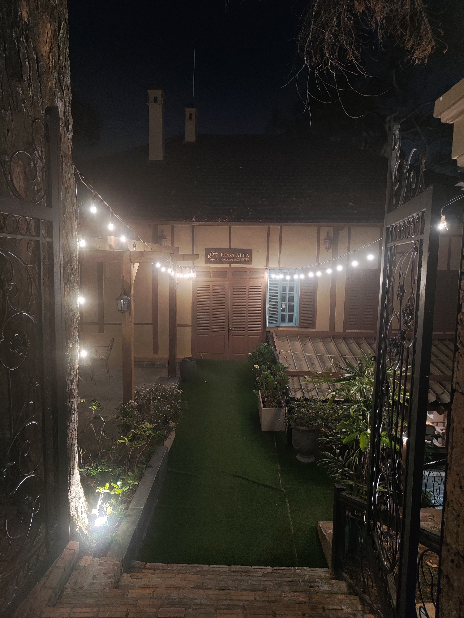 Captured at night in Da Lat, Vietnam, the scene presents the exterior of the "Rosa Alba" restaurant and coffee house. The building features a distinctive architectural style with a light beige facade contrasted by brown timber framing and a dark roof. The entrance is flanked by dark iron gates on either side, giving a glimpse into a narrow garden path covered in green artificial turf. Potted plants line the path and the base of the building. A string of lights is suspended above the path, illuminating the scene. A single window with a striking blue frame is partially covered with brown shutters. Chimneys can be seen rising above the roof of the building. No people are visible.
