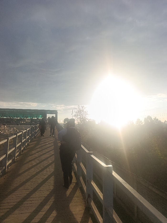 This image depicts a pedestrian overpass or bridge in Kahawa Wendani ward, Kenya. A bright, low-angle sun, positioned in the upper right quadrant, creates intense glare and strong backlighting, silhouetting the subjects. In the immediate foreground, one individual is observed from behind, wearing dark attire and a backpack, walking towards the sun's direction. Several other human figures are visible further down the path, also proceeding in the same general direction. The pathway is flanked by light-colored railings, consisting of horizontal bars and vertical posts, which cast long, diagonal shadows across the walking surface. To the far left in the background, a large green-covered structure is present. The right side of the scene features dense natural vegetation beyond the railing. The sky above is characterized by scattered clouds.