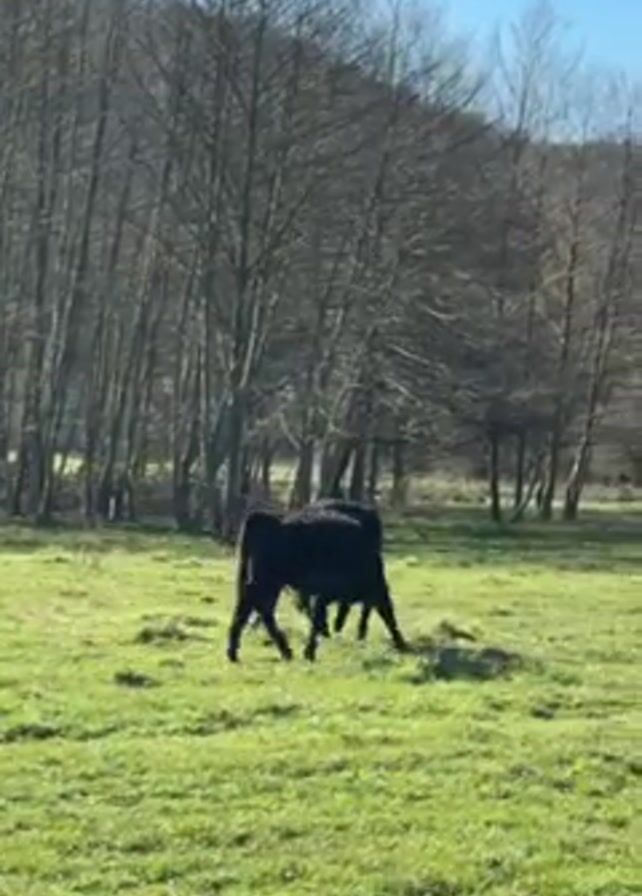 Two black cows are playfully butting heads in a grassy field under a bright, sunny sky. The field is surrounded by a dense forest of bare trees.