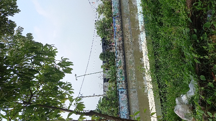 A canal flows between concrete banks adorned with graffiti. Lush green vegetation, including trees and dense ground cover, lines the sides, contrasting with the urban elements. Utility poles with wires extend above the canal, reaching towards a bright sky. A plastic bag is visible amid the foliage on the right bank.