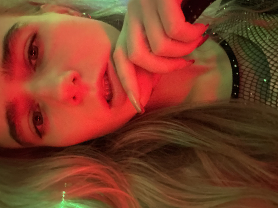 A woman's face, illuminated by red and green light, is centered in the frame. She has full lips, arched eyebrows, and long blonde hair. Her hand, with red nail polish, is near her face. A black, sparkly net material is visible near her neck. The image has a surreal, dreamlike quality due to the unusual lighting.