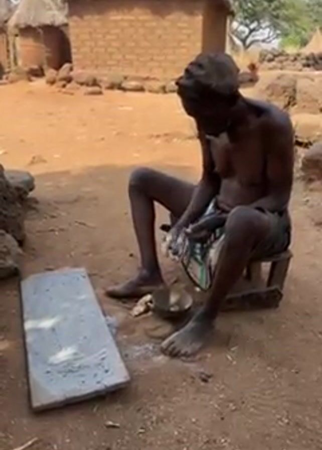 An elderly, bare-chested man sits on a wooden stool in an outdoor setting. He wears a head covering and a patterned cloth around his waist. He is holding and manipulating something small and white in his hands, depositing it into a small bowl at his feet. Next to him is a flat, rectangular gray stone slab covered in a light-colored substance. The ground is reddish-brown earth. Behind him are several small, round mud brick buildings with thatched roofs. The sky is clear and blue. The video shows the man working, and the camera slowly zooms out.