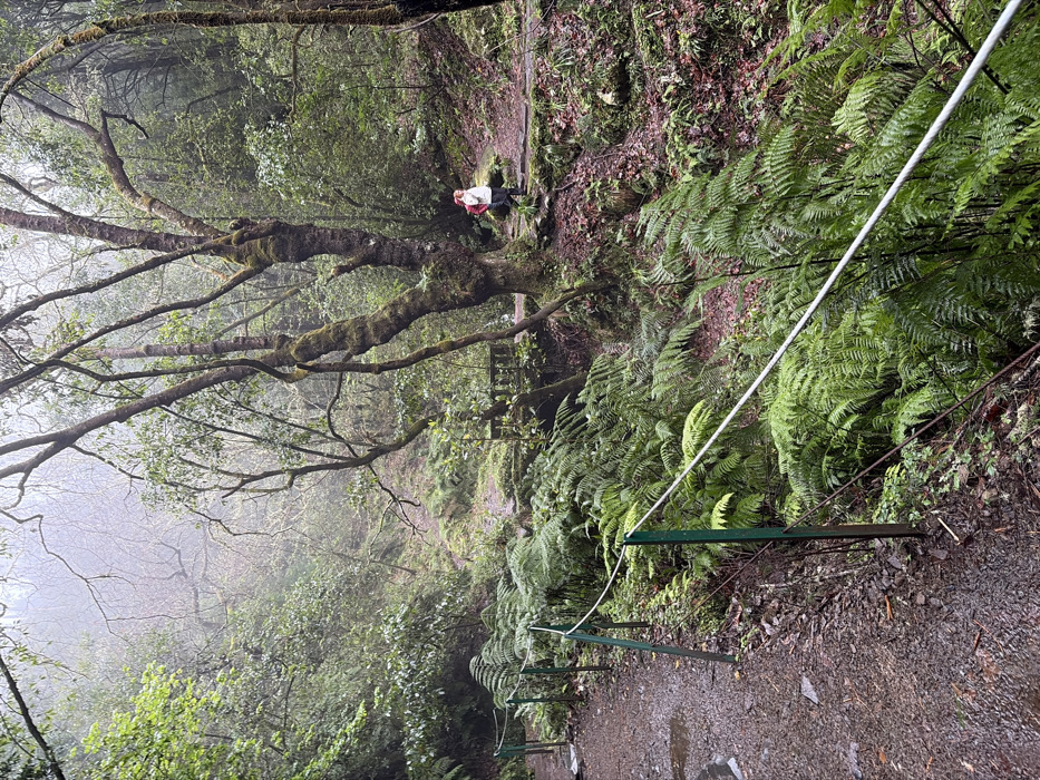 The image depicts a misty, verdant forest scene within the city of Santana, Portugal. A narrow, unpaved dirt path, appearing damp, traverses the left side of the frame from the foreground to the midground. To the immediate right of the path, a safety barrier is installed, composed of dark green metal posts supporting a taut white rope or cable at mid-height, with a darker, thinner cable visible below it. This barrier delineates the path from a steep drop-off into a gully. The gully and surrounding slopes are densely covered with lush green vegetation, prominently featuring numerous large ferns directly adjacent to the path. Beyond the ferns, the terrain descends further before rising again. A small, dark-colored wooden bridge spans a lower section of the gully in the mid-distance. Numerous trees with visible trunks and branches, many covered in moss, are scattered throughout the scene. A prominent, large multi-trunked tree, heavily covered in moss, stands in the mid-right. The upper canopy of the forest is partially obscured by a pervasive mist or light fog, diffusing the natural light. One individual is present in the mid-right section of the image, standing on an elevated patch of ground near the large mossy tree and the bridge. The person is wearing a light-colored long-sleeved top, dark trousers, and a bright red or orange backpack. They are positioned upright, facing generally towards the left side of the frame, appearing to be observing the environment.