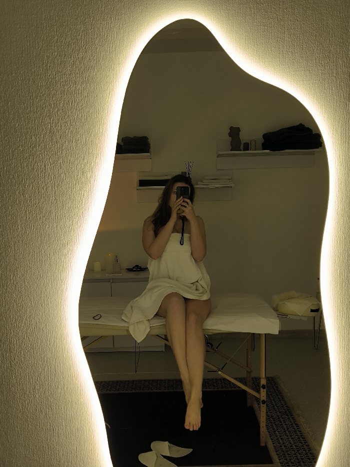 A mirror's abstract, illuminated frame reflects a woman draped in a towel, seated on a massage table. She holds a phone, presumably taking a picture. The reflection reveals a minimalist room with shelves holding towels and other items. Slippers lay on a rug beneath the table. The ambiance is serene, suggesting a spa or wellness setting.