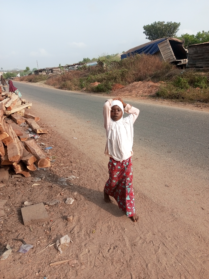 A young girl wearing a white hijab, a white shirt, and a red and teal patterned skirt stands barefoot on a dirt and gravel shoulder beside a paved road. She has her arms raised behind her head. To her left, a pile of cut wood sits near the roadside. In the background, a row of simple structures and vegetation lines the other side of the road. The sky is pale.