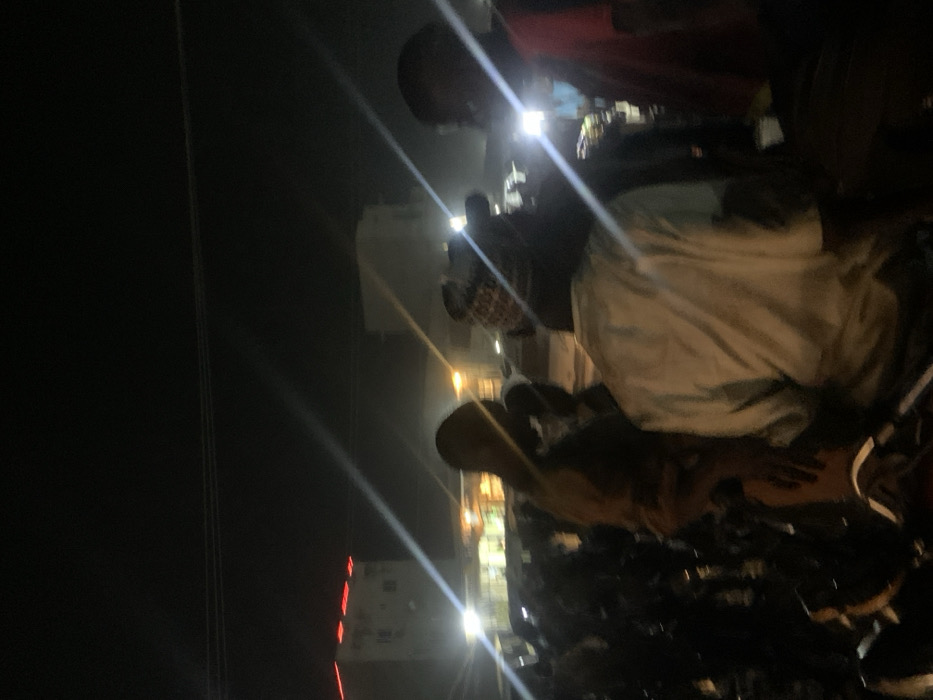 At night, several people stand near a group of parked motorcycles. The lighting is poor, with bright glare spots. Some individuals wear masks. One person has on a white shirt. A tall building with red accents is visible in the distance. Power lines are visible on the left of the frame. The overall scene is cluttered and unclear due to low light and camera angle.