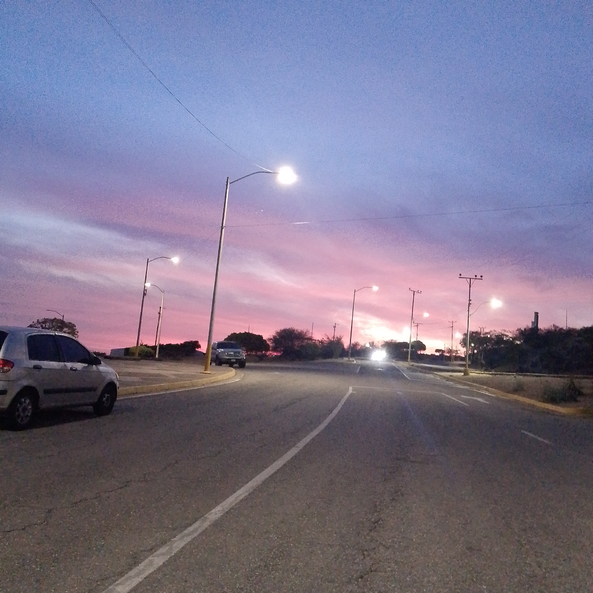 The scene depicts an asphalt road at dusk in Juan Griego, Venezuela
