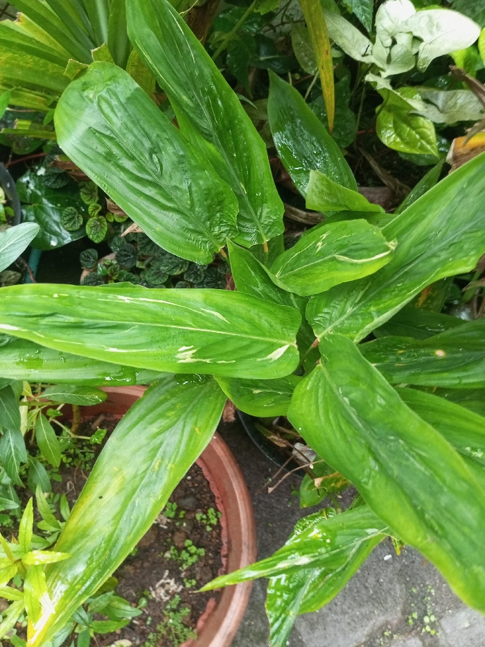 This image depicts a close-up, overhead view of a dense cluster of green plants, situated in a garden or outdoor area within Pandaria, India. The primary subjects are plants featuring broad, elongated leaves, predominantly dark green, some displaying irregular variegation with lighter green to white streaks and patches. Water droplets are visible on the leaf surfaces, indicating recent moisture. In the lower-left portion of the frame, a segment of a terracotta-colored planter pot is visible, containing dark soil from which small, light green sprouts emerge. Additional green foliage from other plants is present in the background, alongside a textured grey ground surface, consistent with paving or concrete. No human subjects, animals, or direct interactions are depicted. The scene presents a well-vegetated, static environment.