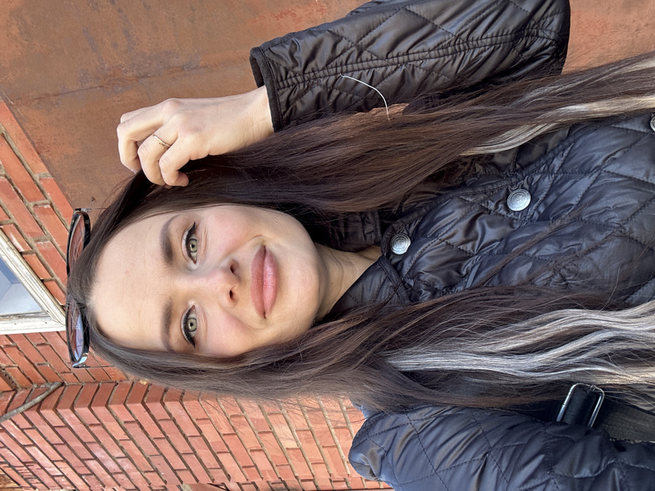 A female subject, appearing adult, is depicted in a close-up, outdoor portrait in Rusalevka, Russia. She has long, dark brown hair with distinct silver-grey streaks, green eyes, and a slight smile while looking directly at the camera. Black sunglasses are perched on top of her head. She wears a black quilted jacket with circular, silver-toned buttons. A light-colored ring is visible on her left ring finger, and her left hand is partially obscured in her hair. A dark strap, consistent with a bag or backpack, is visible over her left shoulder. The background features a red brick wall on the left and a weathered, reddish-brown, possibly metallic, surface on the right. A portion of a window with a light-colored frame is visible at the top, situated between the two background surfaces.