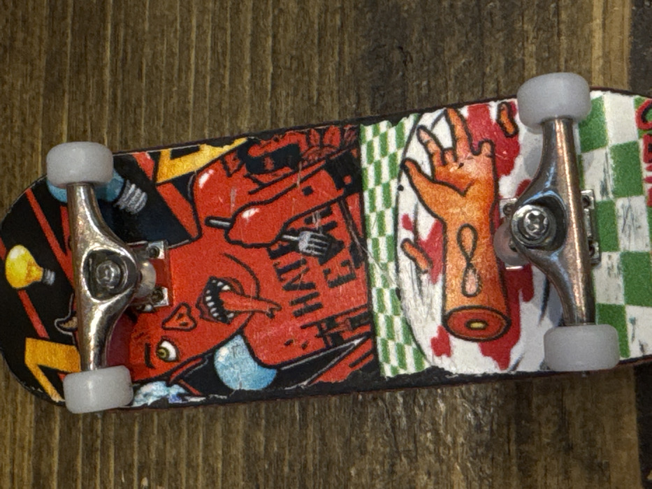 A close-up, angled view displays a fingerboard resting on a horizontal wooden surface with visible grain. The fingerboard's deck features intricate graphics. The upper section of the deck shows a red-skinned, yellow-eyed figure with a gaping mouth and long, forked tongue, holding a four-pronged fork in its right hand. Partial text reading "HATE EA" is visible on the figure's torso. The background of this section is dark, adorned with yellow and light blue stylized lightbulbs and abstract shapes. Below this, a green and white checkered pattern acts as a divider. The bottom section of the deck's graphic depicts a white, plate-like area splattered with red, on which rests a severed orange-toned human hand with distinct fingers and a severed forearm stump, also orange-toned, featuring a circular red cross-section and an infinity symbol. The fingerboard is equipped with two silver-colored trucks and light grey wheels. No visual information in the image identifies a specific location within Saint Petersburg, Russia, or any other city.