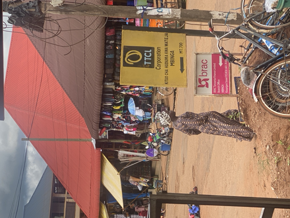 street scene in Mbinga, Tanzania (latitude: -10.95, longitude: 34.998). There are two small shops with corrugated metal roofs on the left side of the street, the one closest to the viewer is closed. The shop on the right has a variety of clothing items displayed for sale on a rack. A woman in a long floral-pattern dress is walking along the dirt street. There are three bicycles parked near a signpost on the right side of the street. The signpost has a yellow sign advertising TTCL Corporation and a pink sign advertising BRAC Tanzania Finance Limited. There are multiple powerlines running across the top of the image. The environment is that of a small town in Tanzania.
