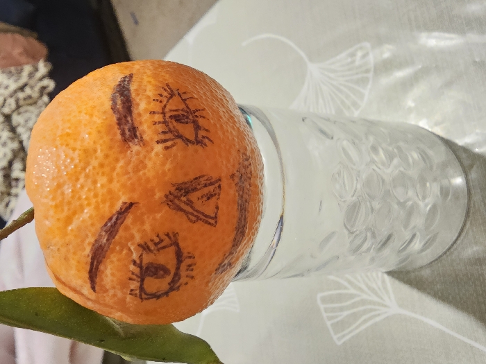 An orange with crude facial features drawn on it rests atop a clear, patterned glass. The orange features cartoonish eyes with radiating lines, heavy eyebrow-like marks, and a triangular mouth. A leafy green branch extends from the base of the orange. The glass is partially obscured by the orange. The background includes a light-colored patterned surface and a glimpse of patterned fabric.