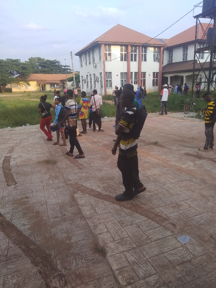 The image depicts an outdoor scene on the campus of the Federal University of Technology Owerri (FUTO) in Ihiagwa, Nigeria