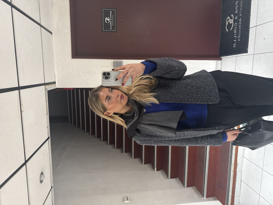 A blonde female adult is captured in a mirror selfie within the interior hallway of a building located at 8, rue Laroque, Aix-en-Provence, France. She is seen from the waist up, wearing a blue long-sleeved top, a dark gray textured jacket, a dark gray scarf, and black trousers. Her right hand holds a light gray ribbed smartphone with a visible camera array, used for the selfie, and her fingernails are painted dark red. A black handbag is held in her left hand. The environment consists of a light-tiled floor, a light-colored stuccoed wall with a small rectangular fixture, and a dark red door on the right. The door features a mirrored sign reading 'SAPPA & CIRILLO AVOCATS ASSOCIES' and an adjacent access control panel. A mirrored floor mat with the same text is positioned below the door. To the left, a staircase with red treads and gray risers ascends into a dimly lit upper level. The ceiling is a grid-panel type with a single recessed light fixture visible.