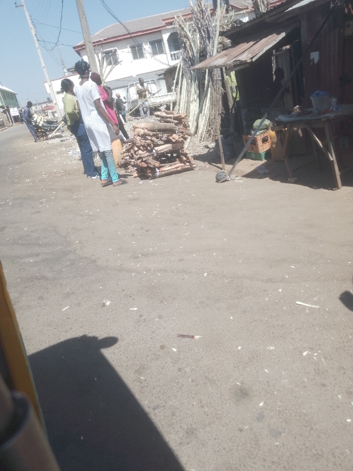The image portrays an outdoor commercial street scene in Jos, Nigeria, under bright daylight. The foreground shows an asphalt surface with scattered light-colored debris, primarily small wood fragments. A dark, elongated shadow, indicative of an object or person, occupies the lower left corner. In the midground, a substantial, neatly stacked pile of cut firewood rests on the pavement. Adjacent to this pile, three individuals are observed: one person wearing a light green top and dark trousers, another in a white polka-dotted tunic over light blue trousers, and a third individual in a red top, partially obscured. All three appear to be standing and facing away or to the side. Further to the left and rear, an additional person is visible near a pushcart or similar utility vehicle. To the right, a makeshift stall with a rusty, corrugated iron roof and walls is present. A wooden table is positioned in front of the stall, holding various items, including plastic bags. Green and brown plastic crates are visible near the table's base. Standing vertically next to the stall is a large bundle of long, thin poles, consistent with sugarcane or construction timber. The background features a two-story white building with a dark, sloped roof and multiple windows. Utility poles and overhead electrical wires are visible against the clear, bright sky. Further down the street on the left, another building with a greenish facade is partially discernible.