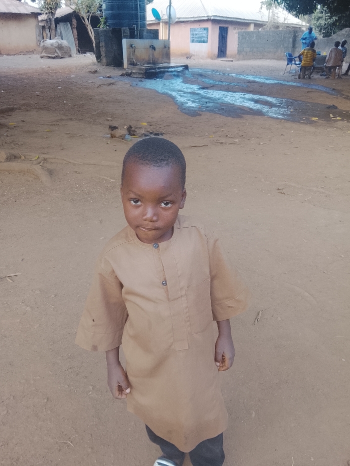 A young boy stands in the foreground, wearing a brown, tunic-like shirt. In the background, a public water source with multiple spouts is visible. A group of people sit together near a building with a simple structure. The ground is mostly bare dirt, with some evidence of water runoff from the water source. The setting appears to be a rural or village environment.