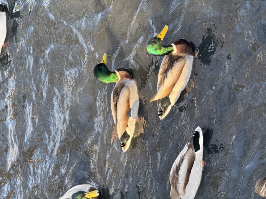 In Zelenogradskiy, Russia, a body of water is populated by several mallard ducks. Three male mallards (drakes) are prominently featured, distinguished by their iridescent green heads, yellow bills, white neck rings, and brown chests. One drake is located in the upper-center, oriented towards the right. Another drake is in the lower-right quadrant, facing left. The left side of a third drake is visible along the far-left edge of the frame. The tail feathers of an additional duck are present in the bottom-left corner, and a partial head of another duck is visible in the top-right. The water surface is dark, rippled, and exhibits numerous small glints of reflected sunlight, indicating an outdoor, daytime environment. No human subjects or direct interactions are depicted.